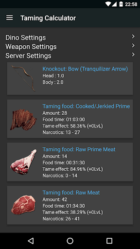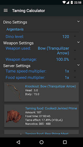 - Taming calculator for ARK: Survival Evolved (includes: tame time for all foods, narcotics, knock out info, food quantity, server multipliers, taming effectiveness, ...)