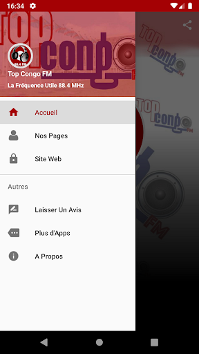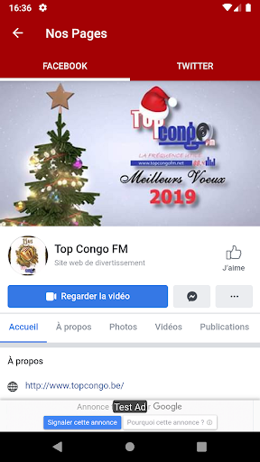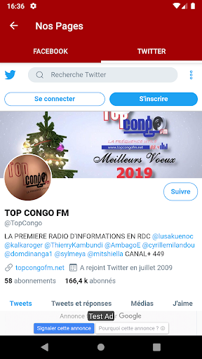 - Suivre les pages officielles Facebook et Twitter de la radio Top Congo FM directement dans l'application sans la quitter (vous pouvez vous connecter sur Facebook et Twitter dans cette application).