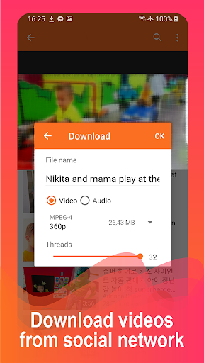 Easily download videos and music directly from the Internet onto your device. All formats are supported. 100% free!