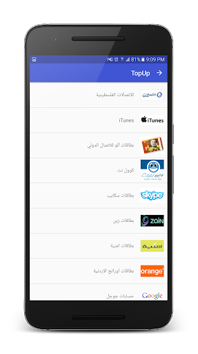 هذا التطبيق يقوم باضافة رصيد للشركات المحلية في فلسطين و اسرائيل مثل جوال و طنية سلكوم بلفون بارتنر هوم و هوت و ازي و كذلك ميرس