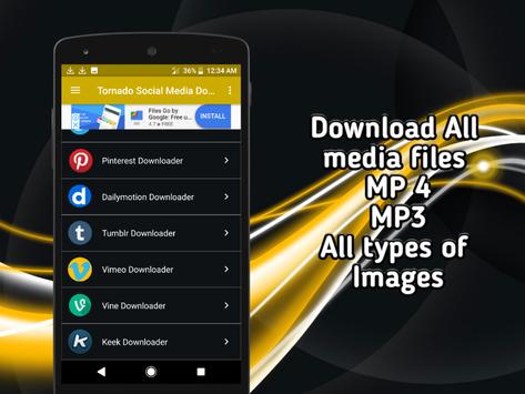 Tornado Social Media Downloader is an All-In-One Downloader allows you to download high quality videos, images, and gifs from multiple social media networks for free. Tornado Social Media Downloader is a simple & easy to use downloader.Social Media Downloader is the ultimate tool to download your favorite social media content directly to your android device instantly.
