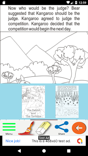 Page 12: The judge Kangaroo announced that the tortoise is the winner. All the animals cheered for him very loud. The tortoise was very happy.