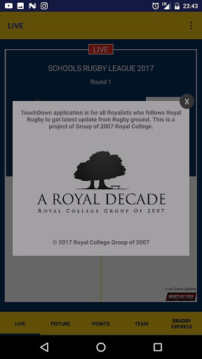 This project is initiated by Royal College Group of 2007 who organize the Bradby Express the train which will travel to Kandy from Colombo with Royal Supporters to watch the Annual Rugby encounter between Royal and Trinity for Bradby Shield. As group of 2007 reaches the 10th year, group has decided to do 10 projects which will give positive affect for our College. As another initiation to uplift Royal Rugby group has decided to develop the mobile application which will help royalist to keep updated on Royal Rugby.