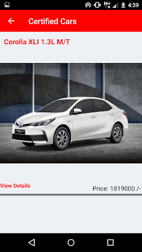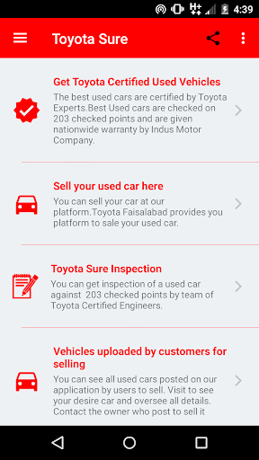 -List of certified vehicles that are checked on 203 point by Toyota Experts. Users can contact company via application for purchasing Car.
