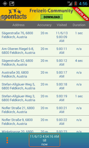 Track your phone location periodically and see them on the map. Address, location accuracy, visit time and duration will be shown.
