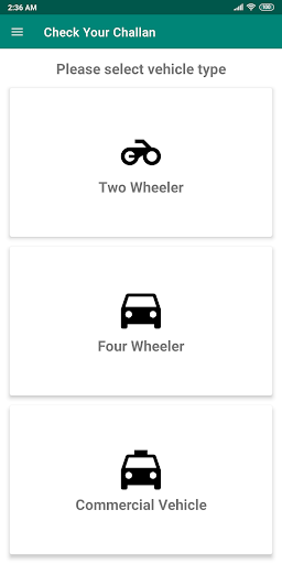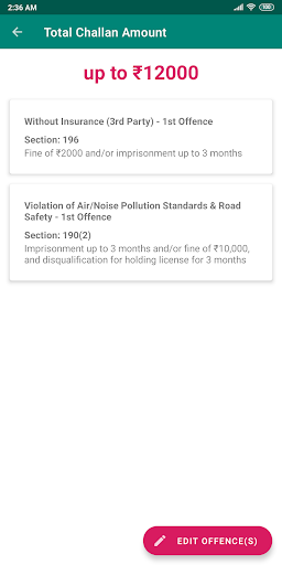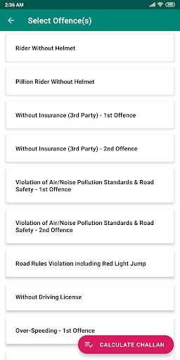 1. Challan Calculator (Home Page) - On the home screen, just select your vehicle type and the offences on the next page to intuitively guide you to the total challan amount you will be fined along with the corresponding imposed sections and details.
