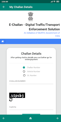 2. My E-Challan Details (Menu Option) - To help you easily fetch details of your E-challan with just a click. The subsequent window will be requiring either of your Challan Number, Vehicle Number or DL Number to quickly fetch the issued E-challan details.