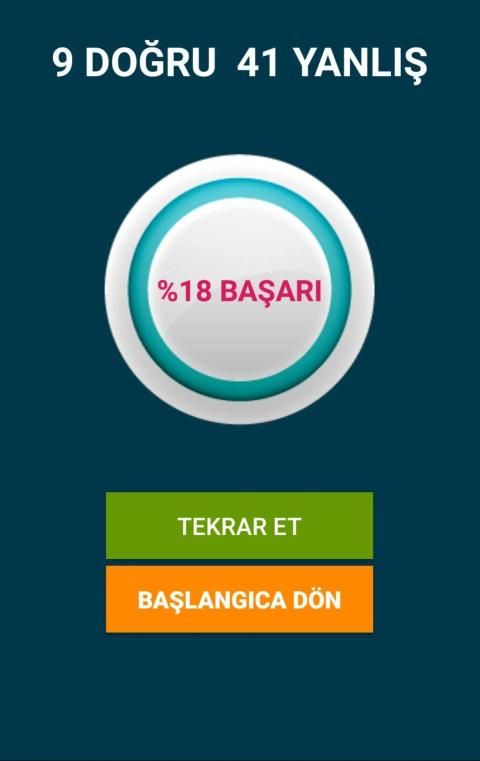 Test bittikten sonra sonuç ekranında doğru ve yanlış sayılarınıza göre % yüzdelik oranda başarınızı görebilirsiniz.