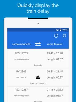 Train Delay saves your departure and arrival places and shows you every race between the two stations. So you'll be quickly informed about the last station in which your train has been detected, about its delay and you'll know if it is already moving.