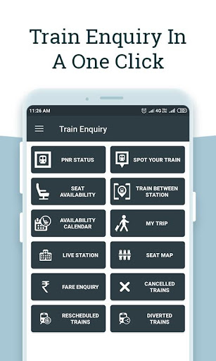 चाहे अपना “PNR जानना” हो या “ट्रेन रनिंग स्टेटस” की जानकारी प्राप्त करनी हो या फिर जानना हो “सीट की उपलब्धता” . इस ऐप के द्वारा आप ये सारी जानकारी प्राप्त कर सकते है सिर्फ एक क्लीक पर .