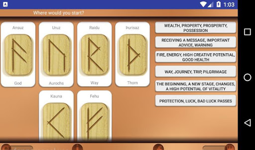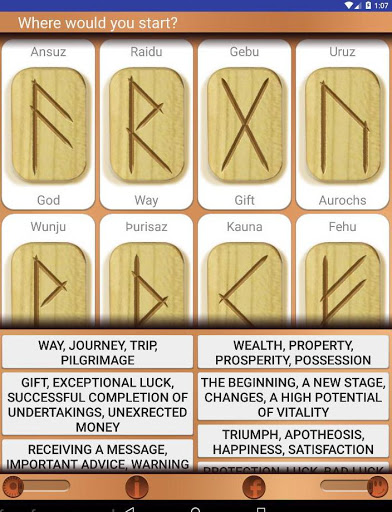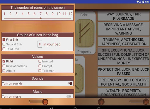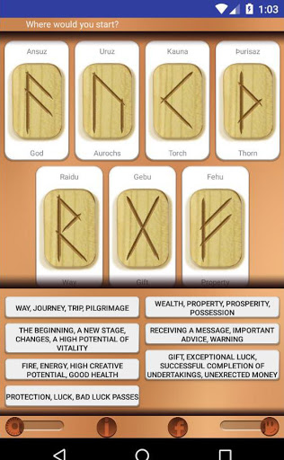 For each rune represented a different sphere of interpretation - predictions for relationships, for business life. There are also brief explanations about the influence of the runes.