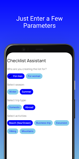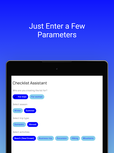 You need to enter parameters of the planned trip and the application will automatically create a packing list with which you can pack your luggage and not forget the things needed for the trip.