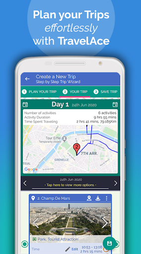TravelAce is powered by Google Maps Places to retrieve updated place information for generating the best itinerary for you, from day one to the very last day of your vacation. A vacation can be both abroad and as a staycation. Places range from tourist attractions, points of interests, adventure activities, parks, museums, natural attractions and everything else that a traveler can do during their journey. Travel plans are fully customizable and highly flexible in order to accurately accommodate the plan - day plans can be modified accordingly. That means you can add places/activities, edit or remove any undesired places or activities. This also includes the time and order of the activities that happen in any given day. Don't worry about WiFi unavailability or data charges, as all traveling plans can be safely exported in PDF format so they can be accessed offline anytime especially during your vacation.