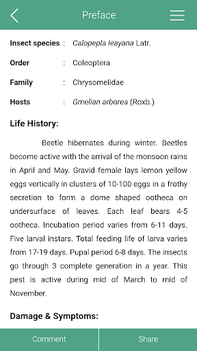 The role of insect pests in forest tree species is well recognized. If the infestation is left unchecked, it may lead to major pest outbreak and finally destruction of large areas of natural and/or planted forests. In view of this, the present mobile application brings out information on the major insect