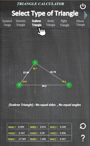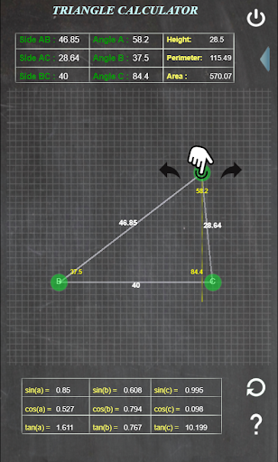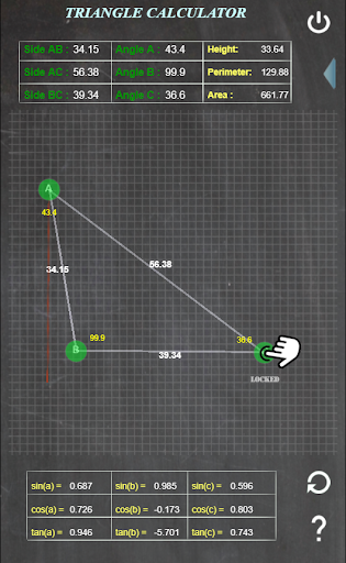 Triangle Calculator is a new app that will simplify your life and will let you calculate the side and angles of any triangle and get all information about it within one tap. Not only that! Our app will also give you a very wide selection of pre-made triangles and also give you the possibility of drawing the lines on the screen and we will take care for calculating the results instantly.