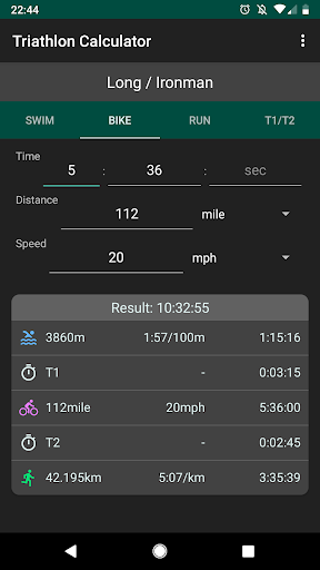 The bike section of triathlon calculator lets you enter your speed, distance and time. Speed can be selected in mph or kph. Distance can be entered in kilometers or miles.