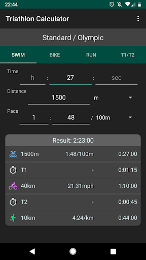 The run section of triathlon calculator lets you enter your pace, distance and time. Pace can be selected per kilometer, mile or per 400m. Distance can be entered in kilometers or miles.
