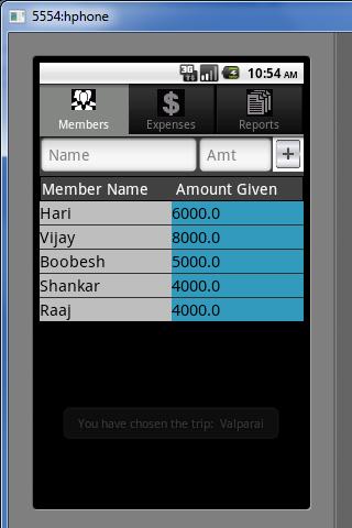 5. Expense Tab - Expense Type and expense amount can be entered in this tab. Pressing the menu button will give a option to add new expense types and delete the existing expense types. Long press on any of the expense in the list will give a screen where you can change expense type, amount. Also customize your expense to specific members.