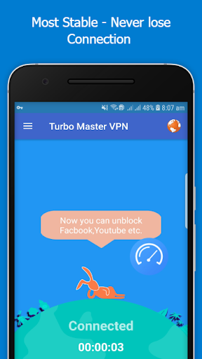 100% free VPN! High VPN speed! The best unlimited free VPN clients for android. Turbo Master VPN – Free VPN proxy, connect as a hare to unblock sites, WiFi hotspot secure and protect privacy.