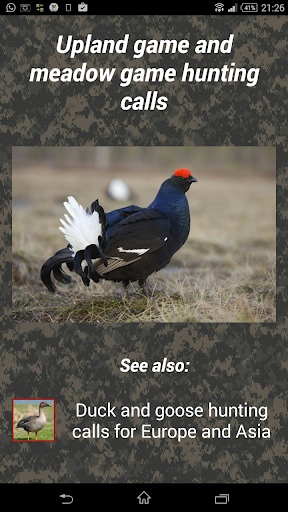 Turkey calls: Hunting sounds Mating calls. program turns your mobile phone into a electronic hunting bird caller . Here you will find the voice of upland fowl and meadow fowl, as well as their image. For best effect can be connected to an external active speaker.