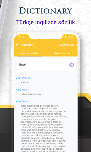 This app to Learn Turkish or Turkish Learning App provides you with proper grammar usage like Noun, Verb, Adjectives, Pronouns etc. All the words are explained in full details and you can Learn English phrases and its usage to help you Speak Turkish. Turkish Speaking or Learning to Speak Turkish has never been more easy.