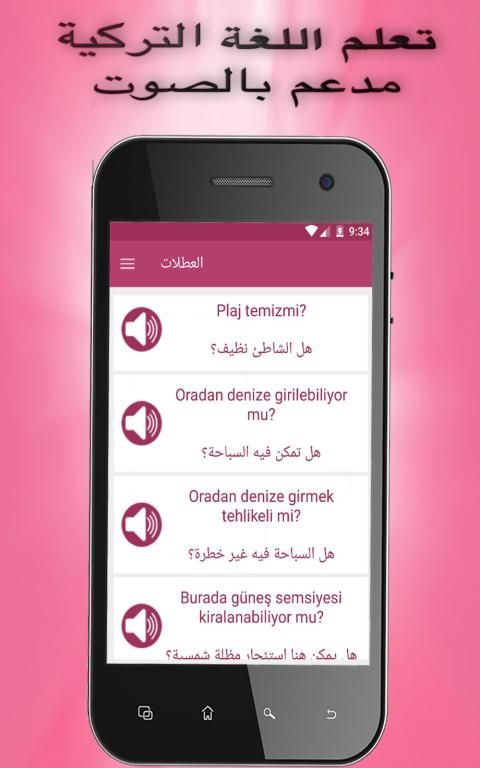 Application of learning the Turkish language is easy to use in mobile, especially for beginners who want to Turkish learn simple Turkish terms that will give Zuartrkiya confidence in the use Allgh.lan learning Turkish language based on the use of mother tongue and authentic speech while ensuring that facilitate understanding by the user and also Learn Turkish Almtgay.hda application is recommended for tourists and businessmen visiting Turkey language.