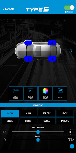The Type S LED App allows you to control and customize your Type S Smart Lighting products for automotive and home personalization. Select from 49 colors and unique lighting modes including strobe, music, fade and more. Create and save up to 10 presets for special occasions, set brightness and light effect speed to your preference. Type S LED requires Bluetooth 4.0 and up.