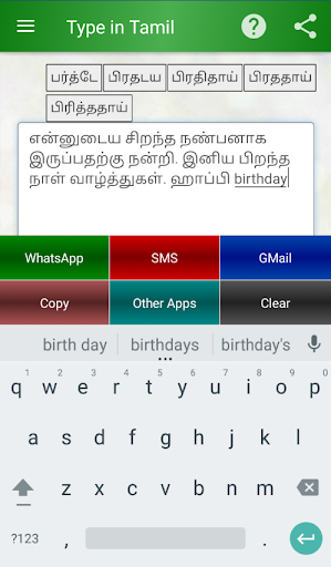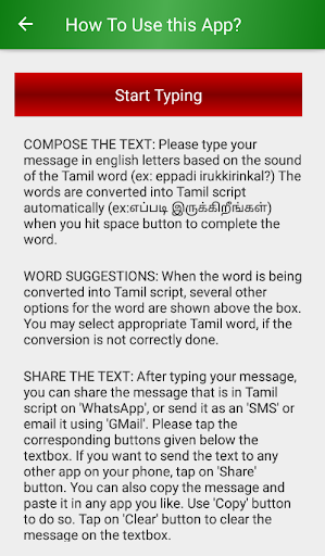 'Type in Tamil ' app is an English to Tamil transliteration tool that intuitively converts Tamil words written in English letters into equivalent words in Tamil script. For example if you type 'eppadi irukkirinkal' it will be transliterated into Tamil script as 'எப்படி இருக்கிறீங்கள்'. You don't need to be exact in typing the word like most other apps and this 'Type in Tamil' app is intelligent enough to understand what you are typing. It allows you to choose from a list of suggested words too.