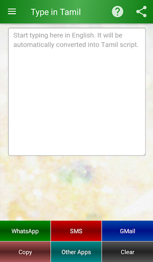'Type in Tamil ' app allows you to share and store the converted Tamil script using any app on your phone such as WhatsApp, SMS Messages, GMail Messages, Saving as Documents etc