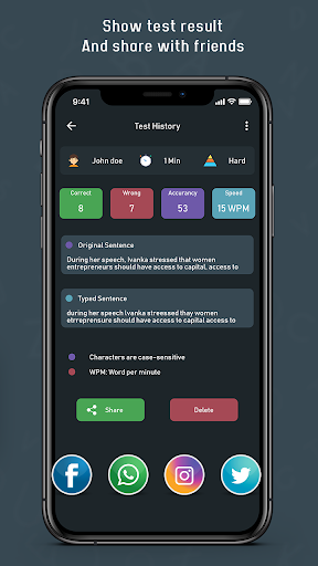 5. Test History : With the Typing Speed Test app give the Typing Test and Save the result of the test for future referral. You can even download and share the result with your friends and family members on Whatsapp, Facebook, Instagram or on any social media.