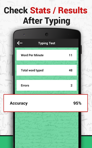 The app provides challenging paragraphs which you need to type. There's a time counter depending upon the character lengths in a paragraph. You need to type as much words as possible within the time frame. The score is in words per minute format. Each correct word will be added to your score and wrong typed word will not be counted.