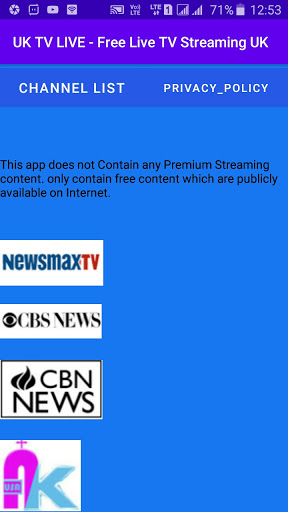 (2) UK TV LIVE app, provides free legal channel streams and offres no premium subscriptions or premium channels. If you think for any reason that one of the channels we provides is illegal, feel free to flag it via email at satteamapps@gmail.com and we'll proceed for its removal.
