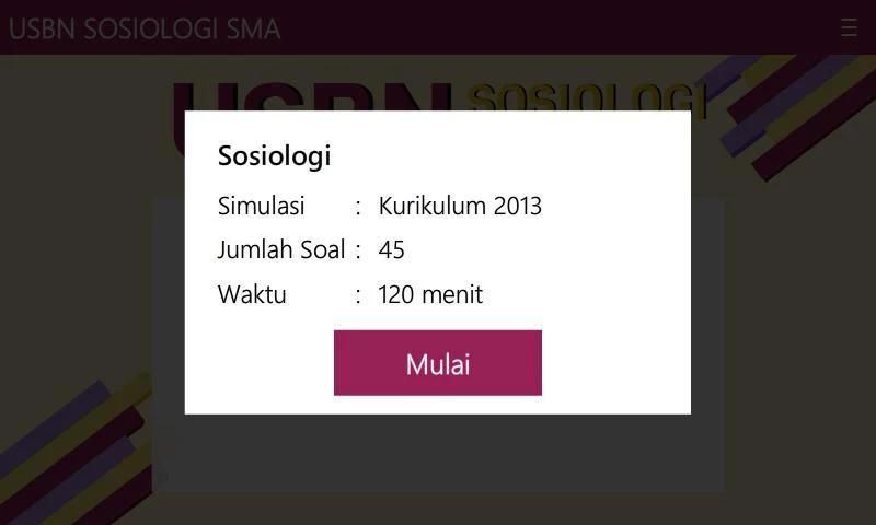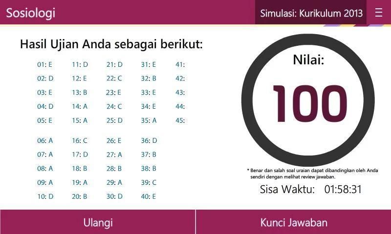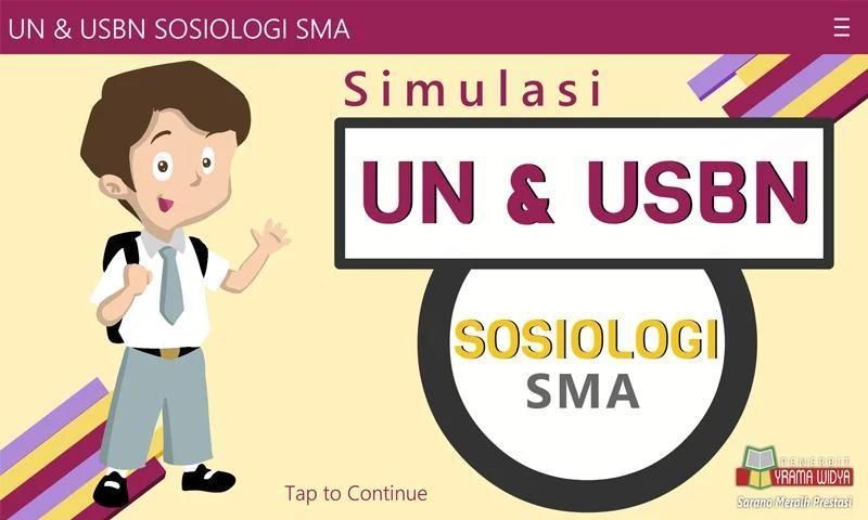 Aplikasi Simulasi UN & USBN Berbasis Komputer Sosiologi SMA/MA. Memuat 2 paket simulasi UN & 2 paket simulasi USBN.