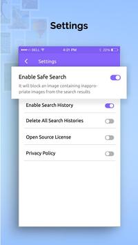- Settings with toggle to enable safe search, enable search history, delete all search histories and privacy policy.