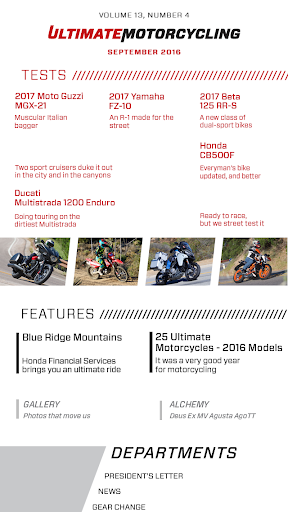 Whether you're into sportbikes, cruisers, touring, customs, or adventure--on or off-road--Ultimate Motorcycling magazine has something for every motorcycle enthusiast. Our passionate staff members are each dedicated to bring you the very best on two wheels. Enjoy our thoughtful reviews and stunning photography on the latest machines, gear, and accessories; as well as travel, lifestyle and human interest feature stories too. Anything and everything to interest the two-wheel aficionado and adventurer is found within the pages of Ultimate Motorcycling.