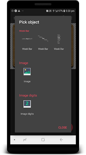 Widget objects - text, shapes, images, weather, graphic (progress), analog clock etc.