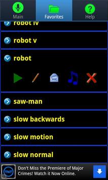 Robot 1-5 (Cylon and other scifi robots),Alien 1-4(Goauld,Asgard),Backwards,Bee,Chipmunk,Cyborg 1-4(Daleks,Cybermen),Deep,Deep Metallic(Darth Vader),Echo,Fast Backwards(foreign language),Fast Normal,Freaky 1-2,Helium(Despicable Minion),Hyper,Metallic,Possessed,Saw-Man(Jigsaw),Slow Backwards,Slow Normal