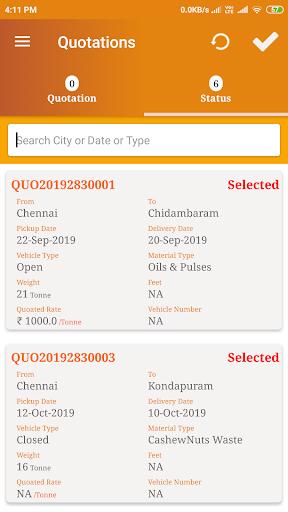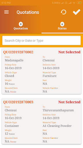 App user gets notifications for truck requirements to transport loads. And to get immediate loads user can also push details about his empty truck. And with his current location availability user can choose to go to any destination. Users can check their status for quotation in the app.
