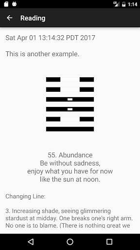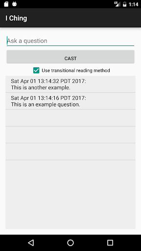 100% ad free. Designed to be as minimal as possible, and requires no permissions. Has a history to view previous questions and answers. Uses the yarrow stalk method under the hood to generate the hexagrams.