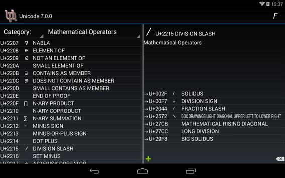 Browse the Unicode character set, examining characters by category or by similarity; search for names containing specified substrings; save a list of favourites for quick reference. Also copy and paste text between this and other Android applications.