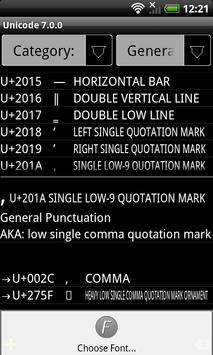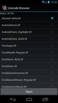 You can display characters for your system font, which is dependent on your Android version, or you can select any .ttf file present in your system installation or on external storage.