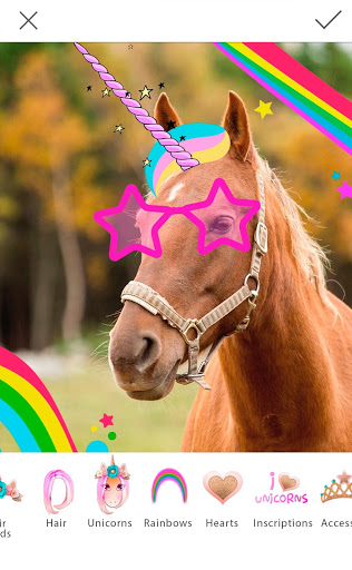 ★With Unicorn Photo Editor you can become a cute unicorn or a beautiful pony, try on a crown stickers and colored hair on a photo, add heart stickers, change hairstyle and much more!★