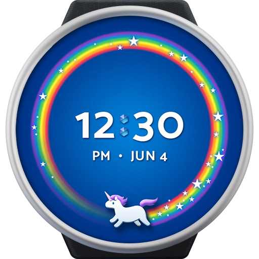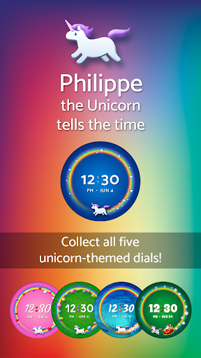 Unicorn Wear Watch Face for Wear OS: Fall in love with Philippe, a unicorn that spreads joy and glitter as he trots in circles to tell you the time.