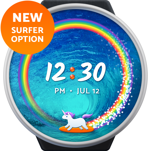 Cowabunga, hang ten on the peak, and test out the epic waves with this surfer-styled unicorn watch face!