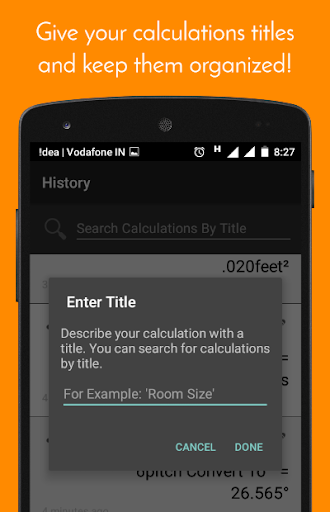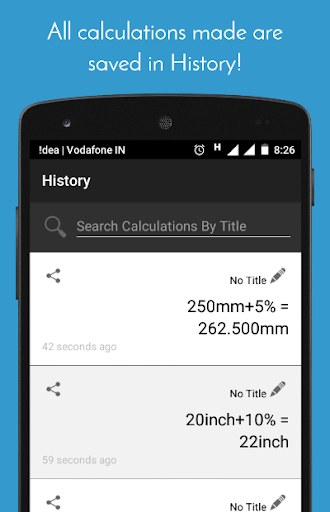 Besides being a unit converter, it is also a full-fledged calculator which allows you to perform calculations effortlessly with or without your units. All calculations are saved in history and can be organized with titles and searched through.