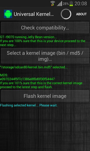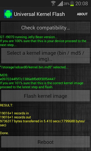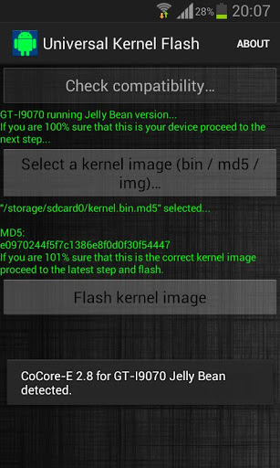 IMPORTANT: This is the free version of the UKF tool for Samsung Galaxy S Advance, if you want to support my job you can choose the paid one ;)Supported devices:GT-I9070 running Jelly bean GT-I9070 running GingerbreadGT-I9070P running Gingerbread* If you want to add a device to the list pm details and a kernel thread to have an example and I will update as soon as possible.Instructions:It's pretty easy, just follow simple few steps:- Press "check compatibility button"- Select a valid kernel image- flash - RebootFAQ:Does it increase binary counter? No.Do I need to be rooted? Yes, of course. Why is it for? With this tool you can flash kernels without a PC in your Android, easy and safer than never, just select the kernel image, flash and reboot.Why is it safer? It has MD5 checksum to verify that your file is not corrupted, you must want to check it before flashing...I have soft bricked my device flashing an mp3 file (?) what can I do? Flash with odin again, you can optionally flash the kernel only.CHANGELOG AND EXTRA INFO:Original thread on XDA developers forum: http://forum.xda-developers.com/showpost.php?p=37704398