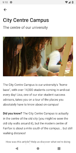 • Sometimes you need to talk to someone to solve an issue or get some info. With a quick tap of the "conversations" icon, you can be connected instantly to a trained member of staff at your university, ready to solve your problem in real-time. No more awkward emails sent out into the ether.