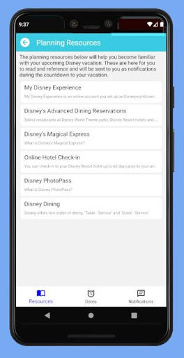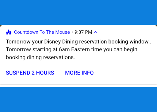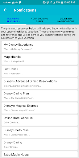 If selected our app will send you notifications and information on all of the important dates for things that need to be scheduled to make your vacation a huge success, such as Fastpass and Dining reservations booking windows. We will also send out fun and useful tips and hints to help you learn more about your upcoming vacation.