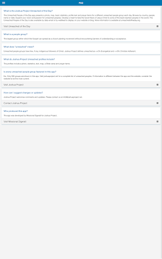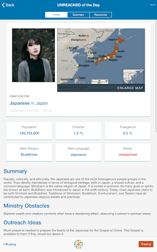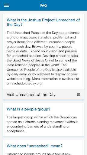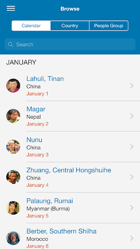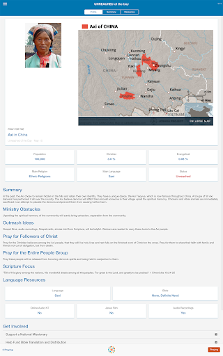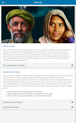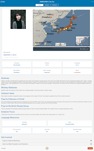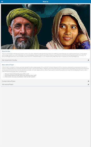 The Unreached People of the Day app presents a photo, map, basic statistics, profile text and prayer items for a different unreached people group each day. Browse by country, people name or date. Expand your vision and passion for unreached peoples. Develop a heart to take the Good News of Jesus Christ to some of the least-reached peoples in the world.