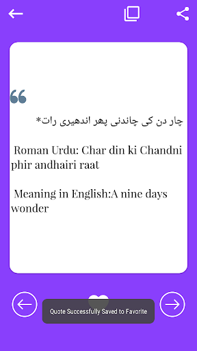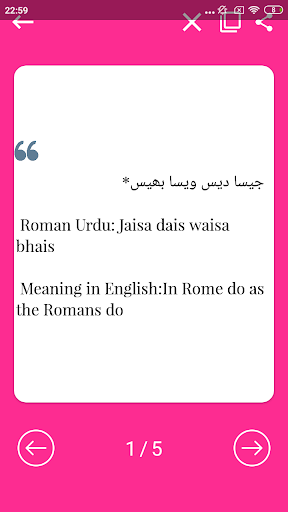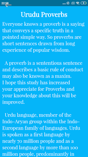 Urdu Proverbs and Meaning language are specially designed to extract the wisdom out of this specific culture. In this app, you can find sayings in Urdu language, Roman Urdu, and pure meaning in English so that people who do not speak Urdu can also understand the true meaning behind the sayings.